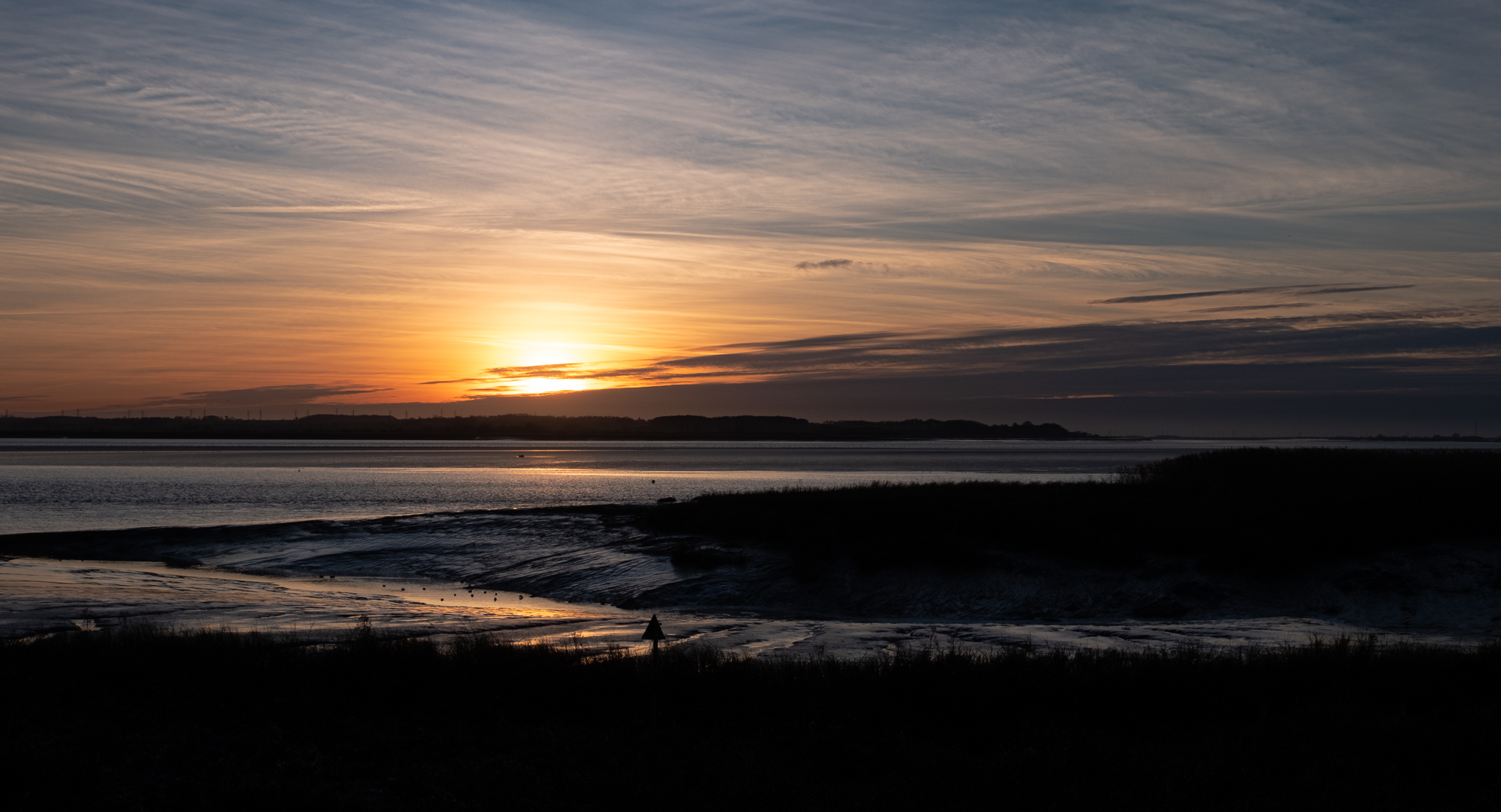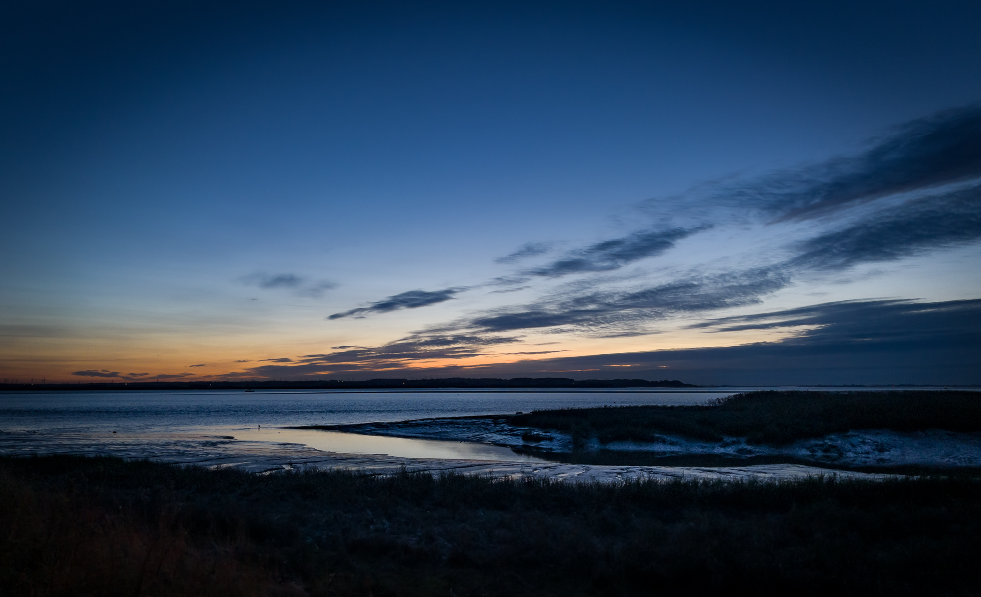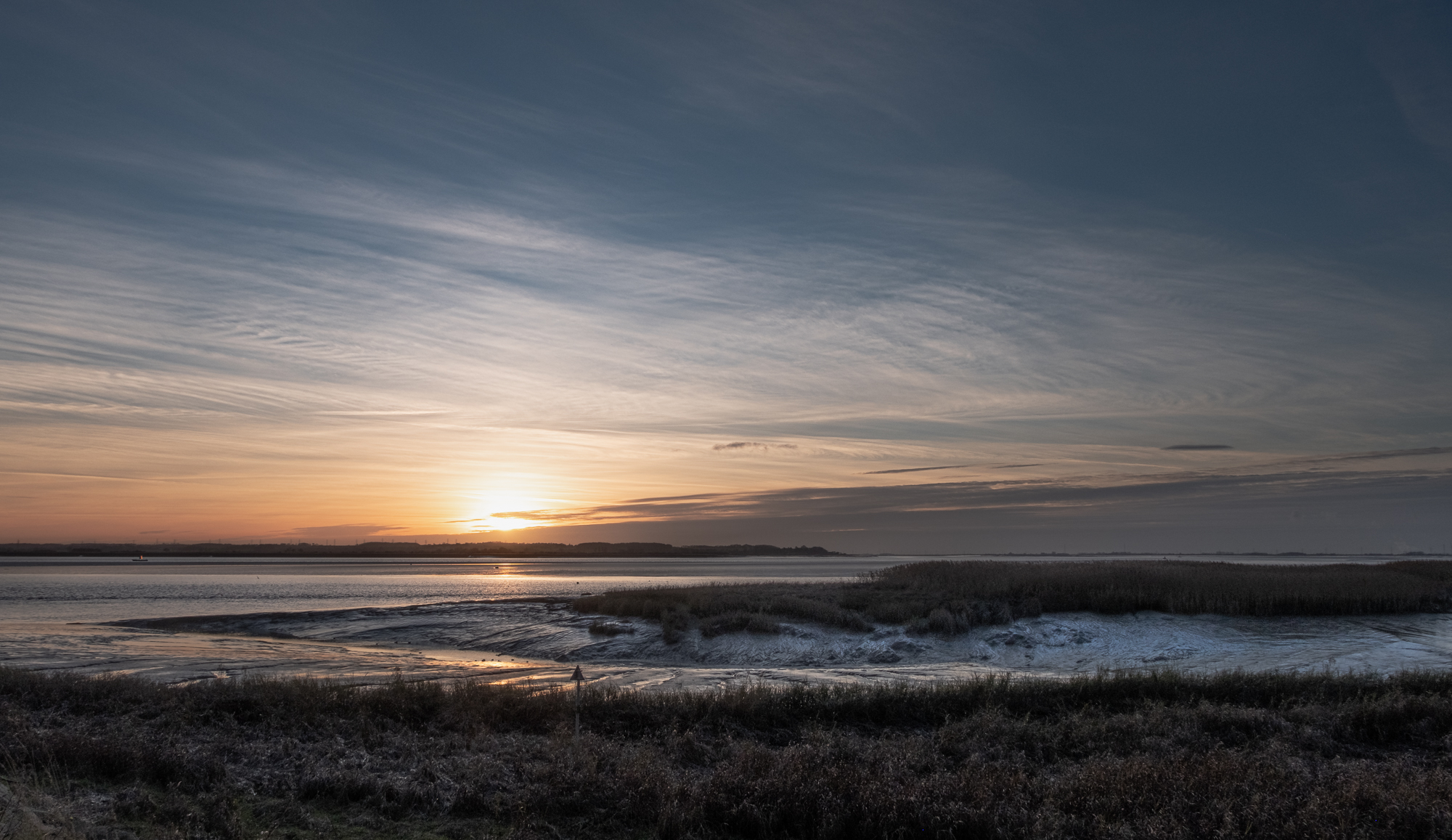 This was a cold but peaceful evening, flocks of Canada geese flying overhead (but not in shot). The whole vista of the river was too much to capture in one photo, a panorama was called for. I have used the panorama facility on the iPhone before but it is usually in desperation as the results are often poor with hard to correct and unnatural distortions. Instead I used my preferred method of taking a series of images and then blending them in Photoshop which gives a much more detailed and accurate view.